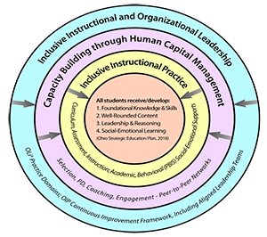 Its operational goal is to improve the learning of children/youth through the use of inclusive instructional practices that support students’ development of foundational knowledge and skills, competence with well-rounded academic content, leadership and reasoning skills, and social-emotional learning – critical domains represented in Ohio’s new strategic education plan. Ohio’s SSoS views districts – and all schools within the district – as the unit of change and improvement.