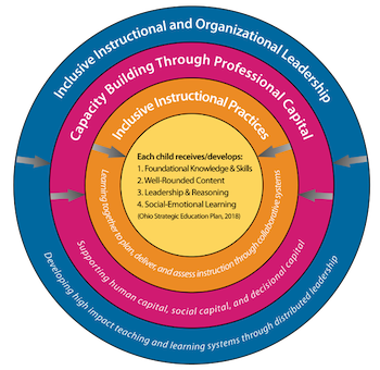 With Each Child, Our Future (Ohio's Strategic Plan for Education: 2019-2024)4, as the backdrop, the State Development Team (a group of state and regional leaders supported by the Columbus-based University of Cincinnati Systems Development & Improvement Center) identified three essential and inter-related areas of practice for guiding the work of the regional system: (1) inclusive instructional practices, (2) capacity building through professional capital, and (3) inclusive instructional and organizational leadership.